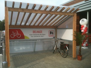 Un parking vélo couvert est installé devant l’entrée du Delhaize. La grande surface promeut l’usage du vélo en installant devant son entrée un parking couvert pour vélos. Belle initiative, après les fontes étanches vendues à un prix intéressant. Dommage, par contre, que la fixation anti-vol ne soit pas adaptée (une barre au fond de l’abri).